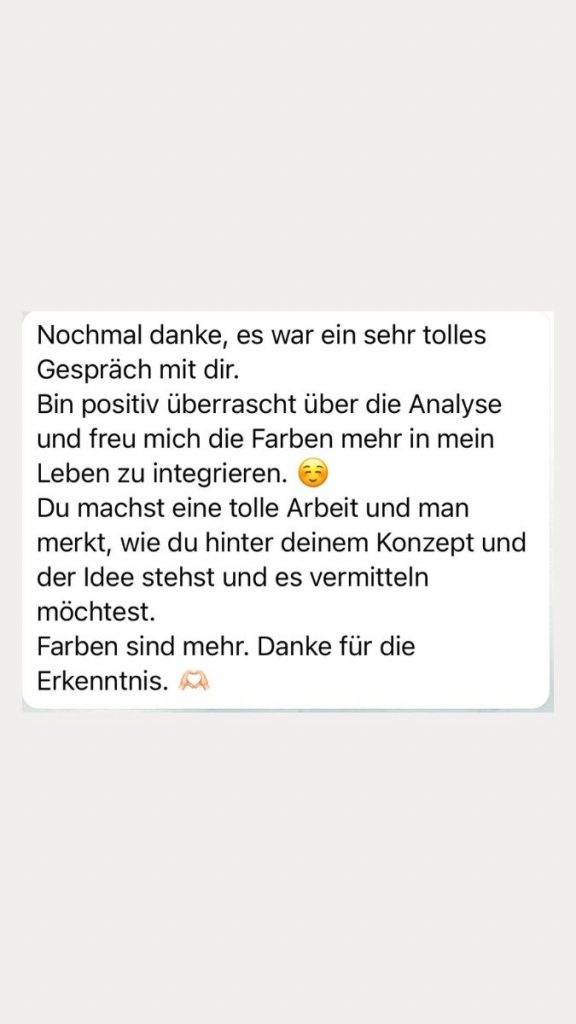 In meiner Farbanalyse begleite ich dich auf einer Reise zu deinen persönlichen Farben: Farben, die dich nähren, stärken und sichtbar machen. Du bekommst nicht nur ein Farbprofil, sondern ein Werkzeug, das dich im Alltag begleitet – für Kleidung, Accessoires oder die Gestaltung deiner Räume.