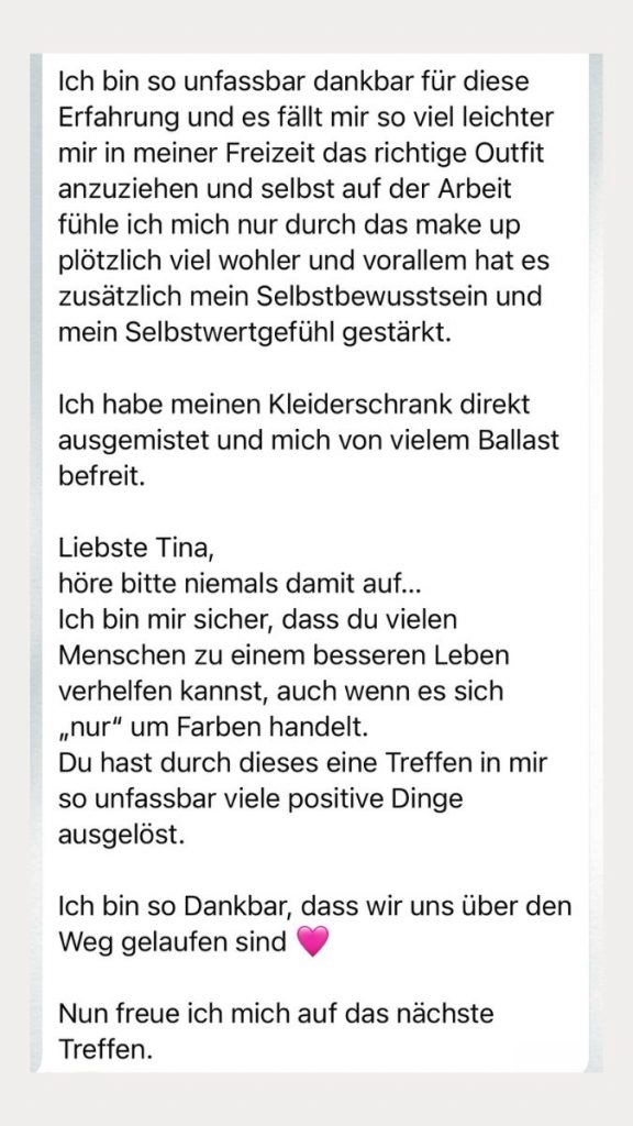 Du erhältst dein individuelles Farbkonzept, das du sofort für Kleidung, Accessoires oder Raumgestaltung nutzen kannst.